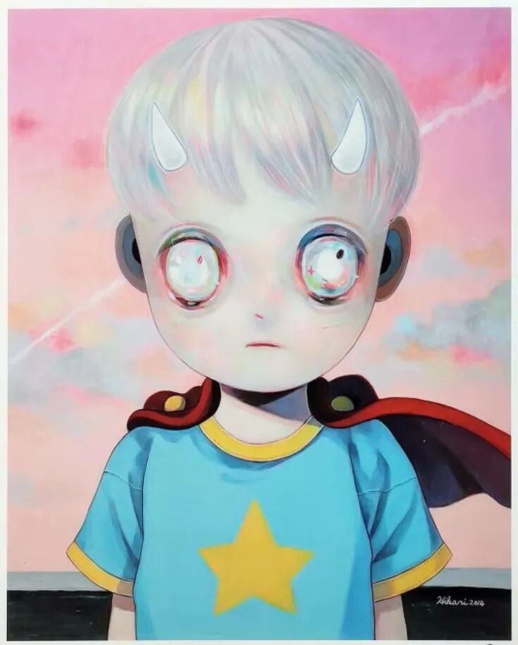 日本艺术家下田光通过自己的作品,希望让观众能与自己营造的黑暗艺术世界产生联系。例如,她笔下色彩艳丽的视觉效果中常包含了温暖阳光的儿童、彩虹、星星,与恶魔角、冰冷的眼神等黑暗的元素并置。